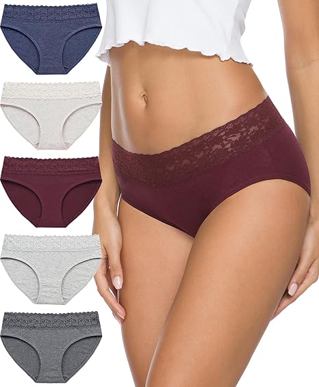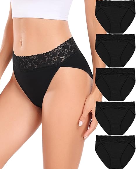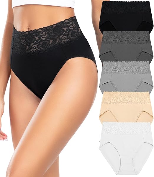 Womens Underwear Cotton Bikini Panties for Women High Waisted Lace Hipster Stretch Briefs for Ladies 5 Pack