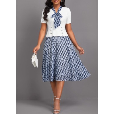 Patchwork Tribal Print White Tie Collar Short Sleeve Dress