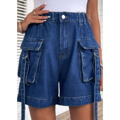 Pocket Denim Blue Button Fly High Waisted Shorts