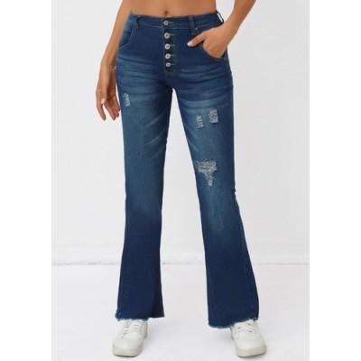 Pocket Denim Blue Flare Leg Button Fly Jeans