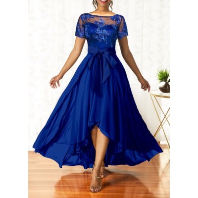 Sapphire Blue Lace Patchwork Belted Maxi Dress
