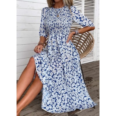 Smocked Ditsy Floral Print Blue Round Neck Dress