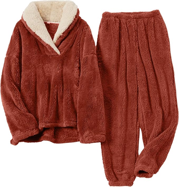 Women Fuzzy Warm Fleece Pajamas Sets Winter Flannel Sleepwear Fluffy Pajama Pullover Top Lounge Pants Set