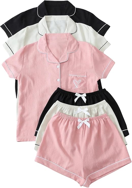 Women's 6 Piece Pajama Sets Heart Print Short Sleeve Button Down Shirts and Shorts PJ Set