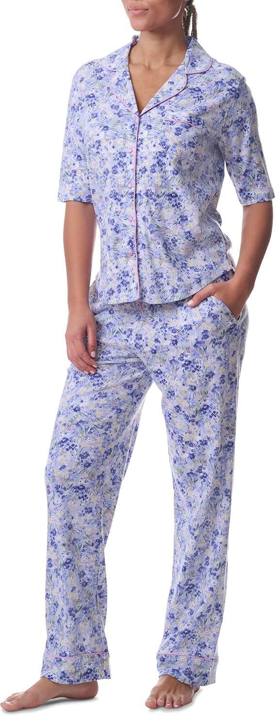 Women's Short-Sleeve Notch Collar Top and Pant Pajama Set