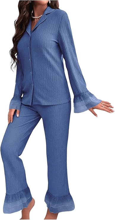 Women's 2 Piece Pajama Set Textured Ruffle Long Sleeve Shirt and Pants Lounge Set Sleepwear