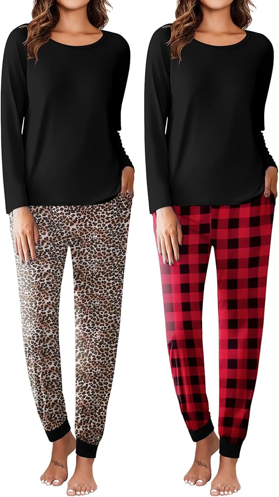 2 Pack Womens Pajamas Set Long Sleeve Sleepwear Top and Jogger Pants Lounge Sets Cozy Pjs Loungewear S-XXL