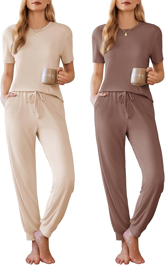 2 Pack Womens Pajama Sets Short Sleeve Tops Jogger Pants Lounge Sets Soft Loungewear Printed Pj with Pockets