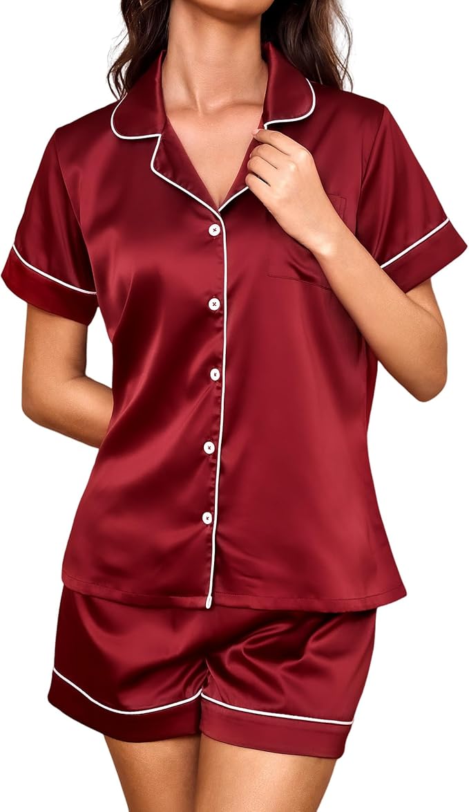 Womens Silk Satin Pajamas Set Short Sleeve Button Down Tops and Shorts Sleep Sets 2 Piece Sleepwear Pjs S-2XL