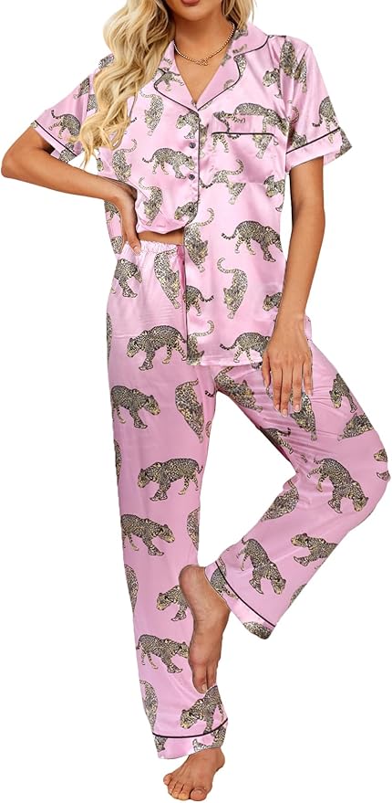 Silk Satin Pajamas Set Women Short Sleeve Sleepwear Soft Button Down Loungewear Pjs Set