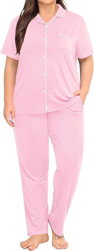 Women's Plus Size Pajama Set Short Sleeve Sleepwear Top and Pants Button Up Pajamas for Women Loungewear