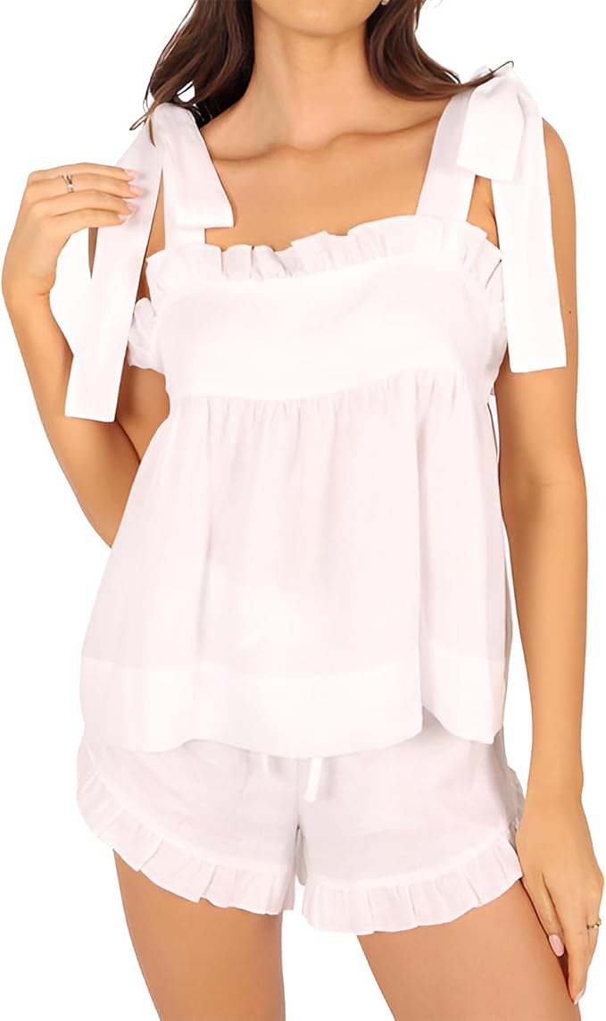 Womens Summer 2 Piece Set Sleeveless Tie Straps Ruffle Trim Top and Shorts Sets Soft Cozy Pajamas Set