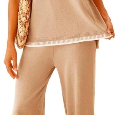 Set 2 Piece Outfits Short Sleeve Knitted Pullover Wide Leg Lounge Pants Tracksuit