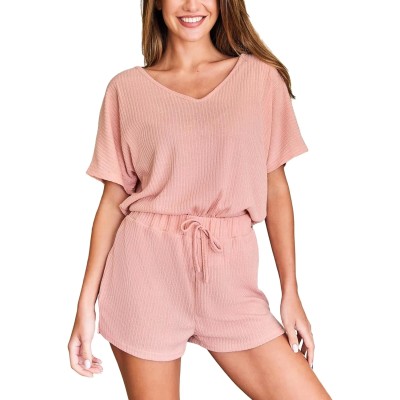Ribbed Knit Pajama Sets for Women Short Sleeve Loungewear V Neck Pjs Shorts Sets